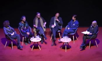 Image caption: Panellists, Lucia Pietroiusti, Haroon Mirza, Jessica Sweidan, Gus Casely-Hayford and Fiona Banner discussing the role of art in social and environmental change with moderator, Louisa Buck.